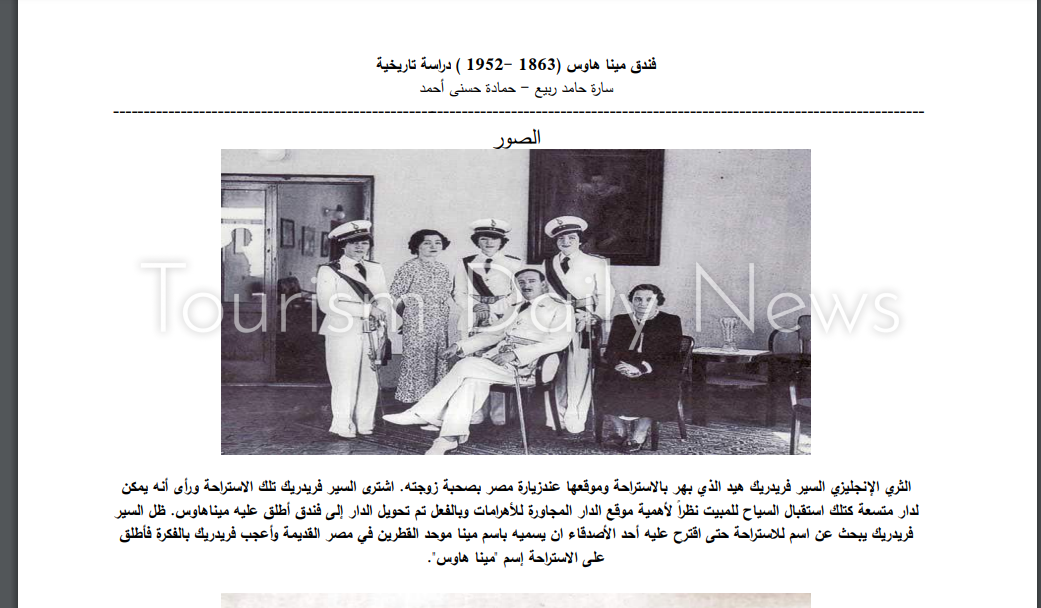 نشرت مجلة اتحاد الجامعات العربية للسياحة والضيافة، ورقة بحثية تحت عنوان ” فندق مينا هاوس (1863 – 1952) دراسة تاريخية ، والبحث تناول تاريخ انشاء الفندق، وتطوره العمراني وأهم الأحداث السياحية والاجتماعية التي شهدتها.