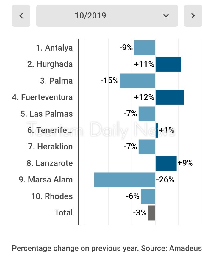 وفى اليونان شهدت كل من هيراكليون انخفاضا بنسبة 7٪، ورودس 6%، وذلك على عكس النمو القوي في سبتمبر.