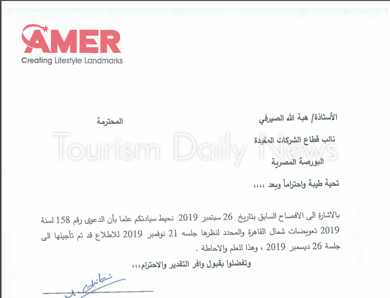 أعلنت مجموعة عامر القابضة عن تأجيل دعوى التعويض رقم 158 لسنة 2019 مدني كلي شمال القاهرة المقامة من انترادواس للتطوير السياحي وأخرون ضد عامر وبورتو جروب والتي كانت محدد لنظرها جلسة يوم 21 نوفمبر الجاري الي 26 ديسمبر المقبل.