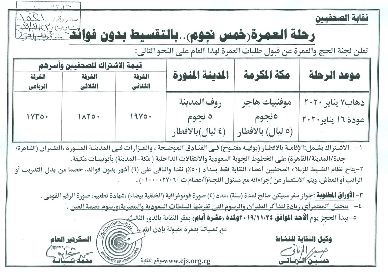 كتبت – مروة السيد : أعلنت لجنة الحج والعمرة بنقابة الصحفيين عن قبول طلبات العمرة لهذا العام بالتقسيط لأعضاء النقابة فقط بسداد 50 % نقداً والباقى على 6 شهور بدون فوائد وإلى نص الإعلان :
