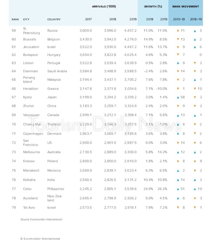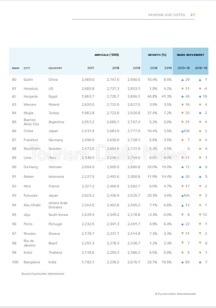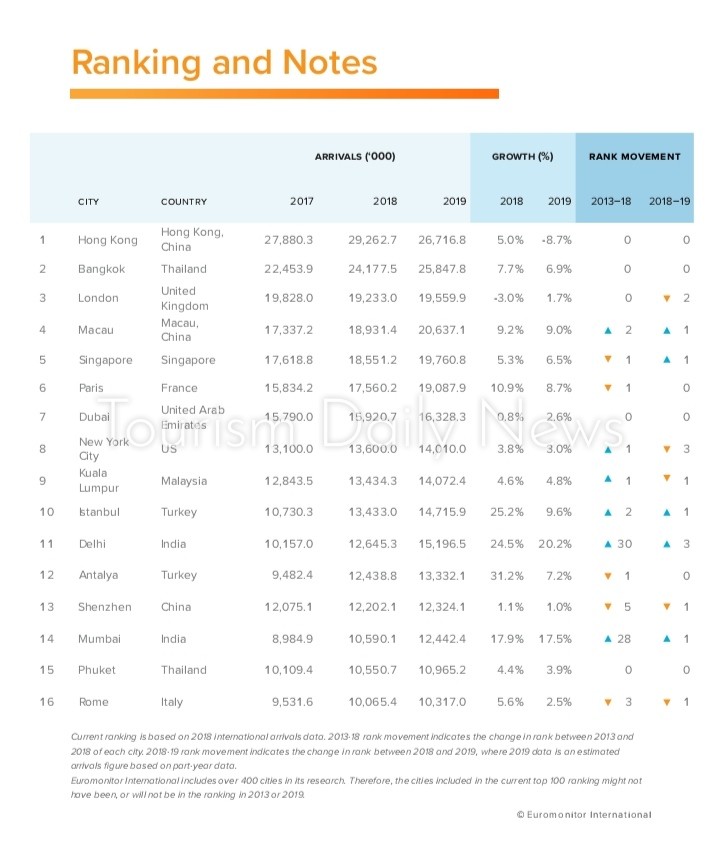 وبحسب التقرير تصدرت هونج كونج قائمة الوجهات السياحية الأكثر جذباً للسياح خلال عام 2018، مع توقع استقطابها نحو26.7 مليون سائح فى 2019، تلتها بانكوك بنحو 24.1 مليون سائح، ثم لندن بنحو 19.2 مليون سائح، وماكاو الصين بنحو 18,9 مليون سائح، ثم سنغافورة في المرتبة الخامسة بنحو 18.5 مليون سائح، تلتها باريس بنحو 17.5 مليون سائح، ثم دبي في المرتبة السابعة عالمياً بنحو 15,9 مليون سائح.