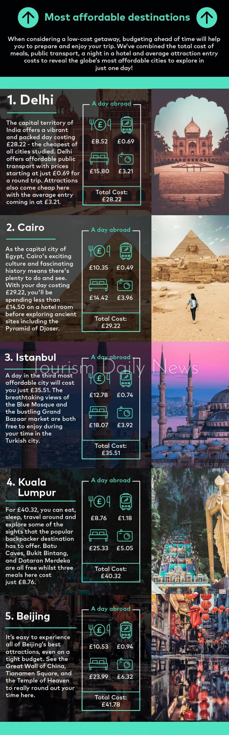 بينما تصدرت نيودلهى بالهند قائمة أرخص المدن السياحية، بمتوسط تكلفة 28.22 جنيه إسترلينى، وجاءت اسطنبول فى المرتبة ثالثة، بمتوسط 35.51 جنيه إسترلينى، تلتها كوالالمبور بمتوسط 40.32 جنيه إسترلينى، وبكين فى المرتبة الخامسة بمتوسط 41.78 جنيه إسترلينى فى اليوم.