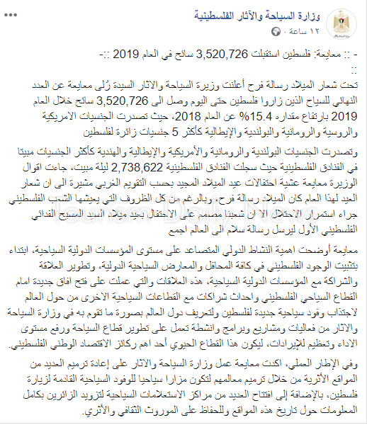 ووفقا للصفحة الرسمية لوزارة السياحة الفلسطينية عبر فيسبوك، تصدرت الجنسيات الأمريكية، الروسية، الرومانية، البولندية، الإيطالية، كأكثر 5 جنسيات زائرة لفلسطين، كما تصدرت الجنسيات البولندية، الرومانية، الأمريكية، الإيطالية والهندية كأكثر الجنسيات مبيتا فى الفنادق الفلسطينية، حيث سجلت الفنادق الفلسطينية 2,738,622 ليلة مبيت.