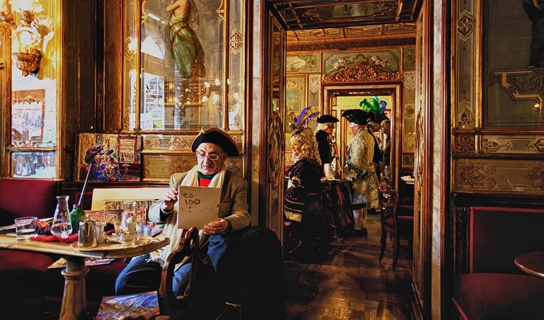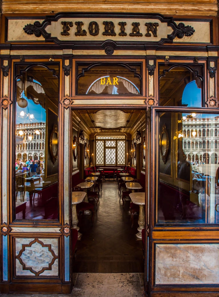 ويقع المقهي في وسط ميدان سان ماركو في مدينة البندقية الساحرة.