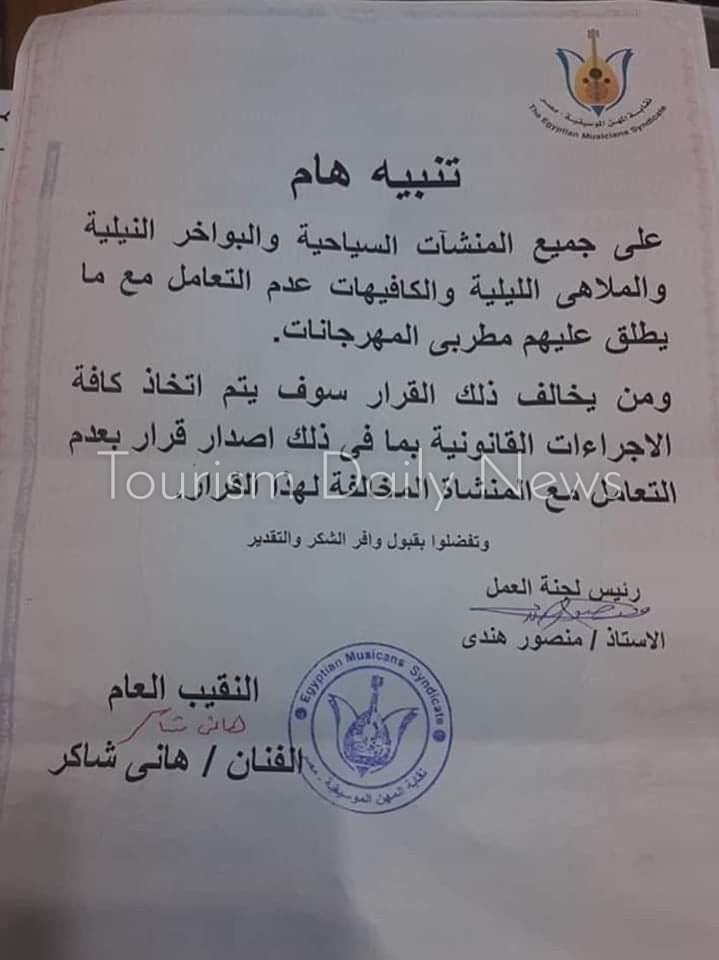 ومن جانبها أكدت غرفة المنشآت السياحية برئاسة عادل المصرى، التزامها بقرار نقابة المهن الموسيقية، حفاظا على الذوق العام وتقديم فن محترم لروادها.