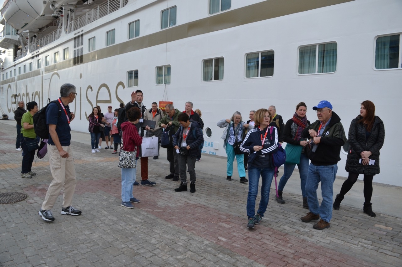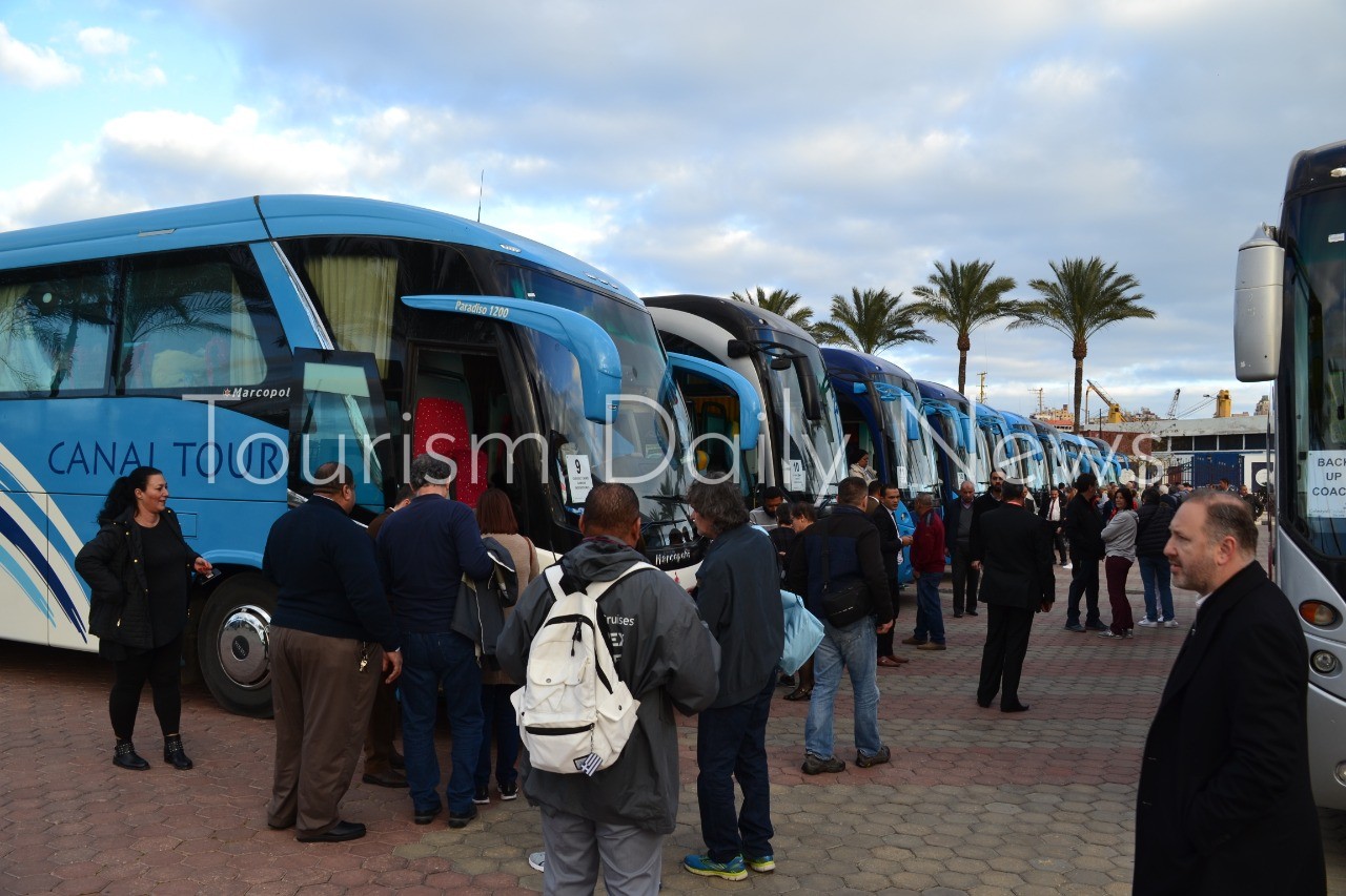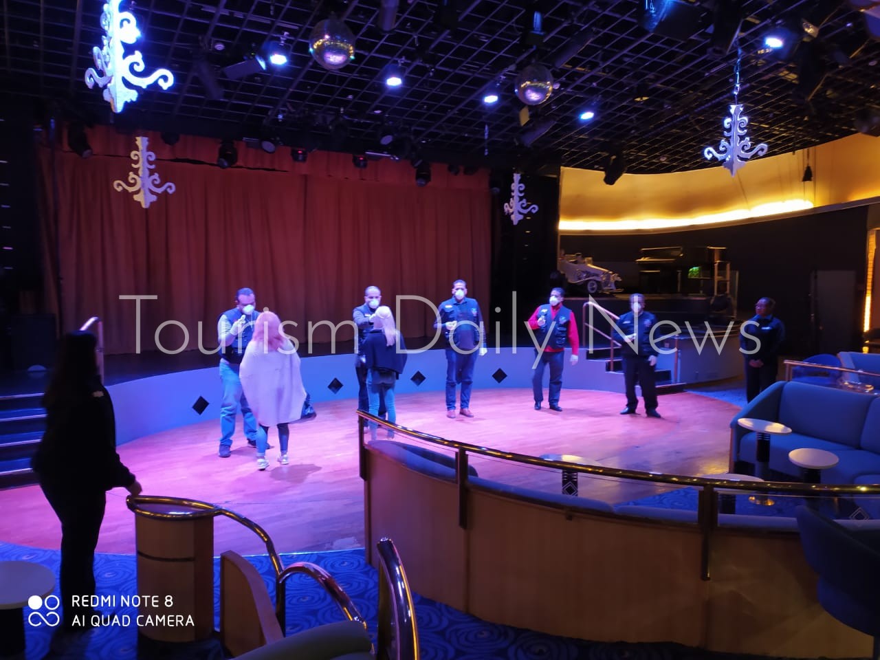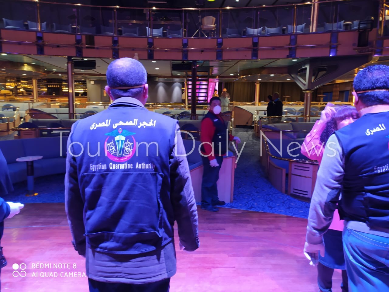 حيث تم الدفع بفريق من إدارة الحجر الصحي قام بفحص السياح وطاقم الخدمة على متن السفينة بمنطقة المخطاف الخارجي قبل وصولها لمحطة الركاب السياحية ، حيث تم إختبار جميع السياح بجهاز قياس الحرارة عن بعد .