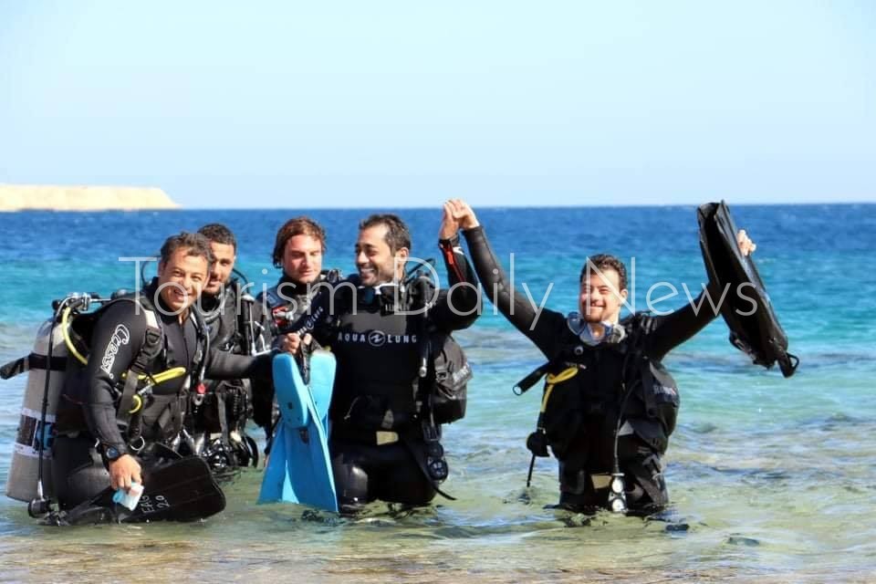 وحمل السباح لافتة “الغوص بالمكان الأكثر أماناً بالعالم _ مصر “لدعم العمل البيئى و الترويج للسياحة البيئة بدعوة العالم للاستمتاع بالمحميات فى مصر.