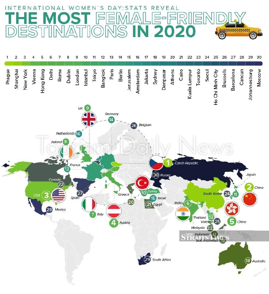 كتب- قاسم كمال: كشفت دراسة حديثة لمنصة “Taxi2Airport” العالمية، عن وجهات السفر الأكثر أماناً للمرأة فى العالم خلال 2020، وذلك بالتزامن مع الاحتفال باليوم العالمى للمرأة.
