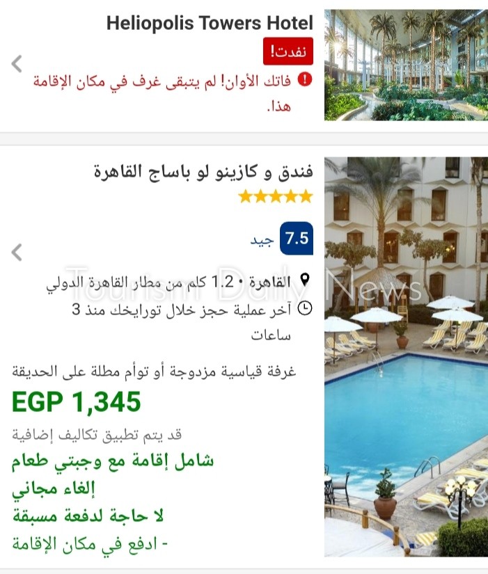 فيما نفدت الحجوزات بالكامل فى عدد منها لمدة 17 يوما متتالية بداية من أول إبريل الجارى وحتى 18 من الشهر نفسه، أبرزها فندق لو ميريديان مطار القاهرة، المصنف 5 نجوم، والذي يبعد عن المطار نحو 0.2 كم، وفندق هليوبوليس تاورز، المصنف 5 نجوم، والذى يبعد عن المطار نحو 3.1 كم.