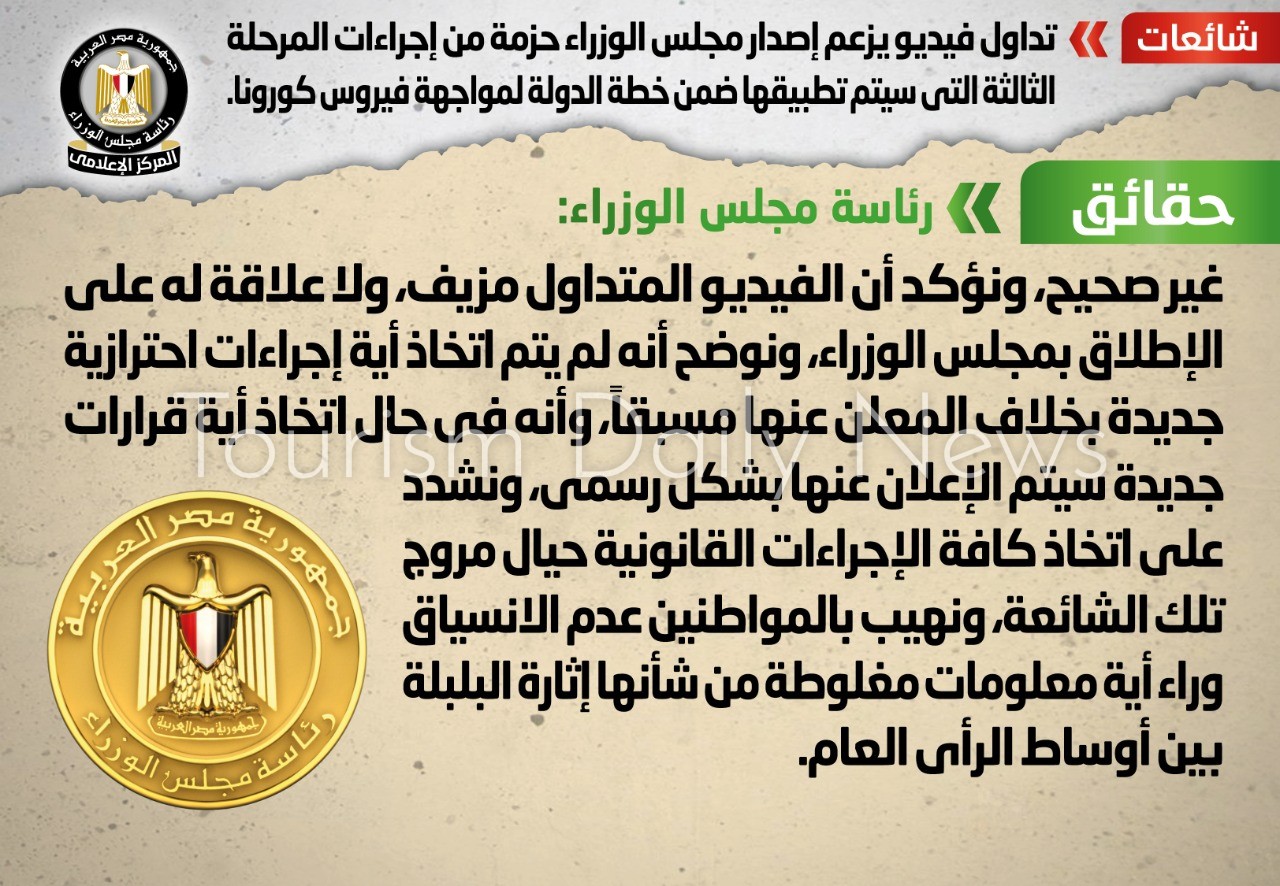 وقال المجلس ، إن الفيديو المتداول مزيف، ولا علاقة له على الإطلاق بمجلس الوزراء، ونوضح أنه لم يتم اتخاذ أية إجراءات احترازية جديدة بخلاف المعلن عنها مسبقاً، وأنه في حال اتخاذ أية قرارات جديدة سيتم الإعلان عنها بشكل رسمي، ونشدد على اتخاذ كافة الإجراءات القانونية حيال مروج تلك الشائعة، ونهيب بالمواطنين عدم الانسياق وراء أية معلومات مغلوطة من شأنها إثارة البلبلة بين أوساط الرأي العام.