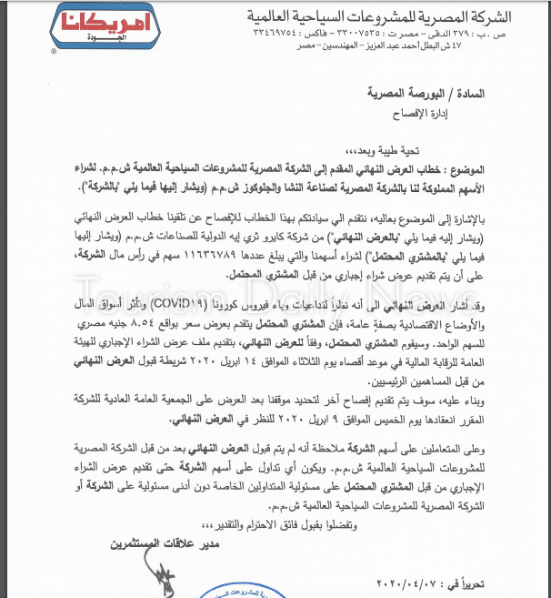 وأشارت إلى أنه على المتعاملين على أسهم الشركة ملاحظة أنه لم يتم قبول العرض النهائي بعد من قبل الشركة المصرية للمشروعات السياحية ويكون أي تداول على أسهم الشركة حتى تقديم عرض الشراء الاجباري على مسؤولية المتداولين دون أدمنى مسؤولية على الشركة أو المصرية للمشروعات السياحية.