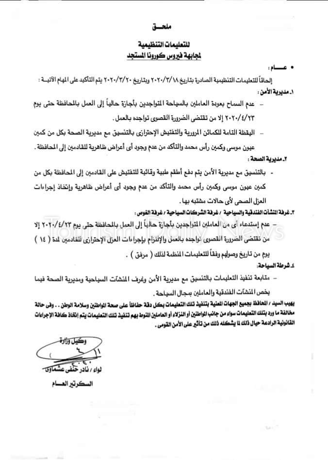 كما أخطرت المحافظة، غرف المنشآت الفندقية والسياحية الشركات السياحية والغوص، بعدم استدعاء أي من العاملين المتواجدين بإجازة إلى العمل بالمحافظة، إلا من تقتضي الضرورة القصوى تواجده مع الالتزام بإجراءات العزل الاحترازي للقادمين لمدة 14 يوما من تاريخ وصولهم.