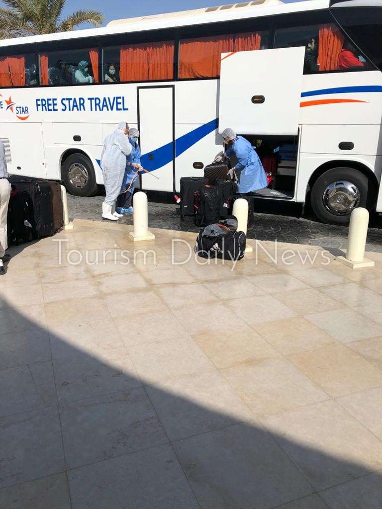 ثم توجهوا على متن أتوبيسات سياحية إلى أحد الفنادق المطلة على البحر بالمدينة لقضاء فترة الحجر الصحي لهم لمدة 14 يوما.