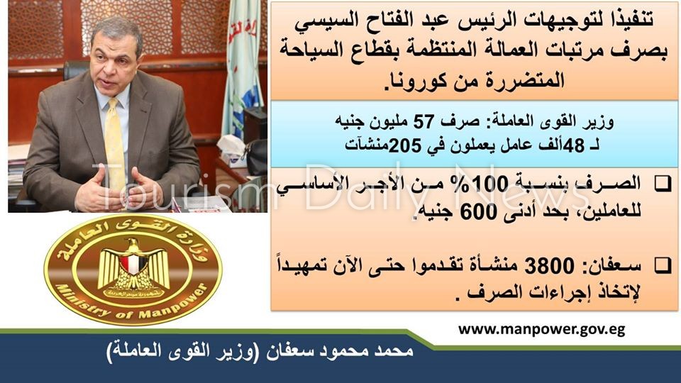 كتبت – سحر عبد الغني : قال محمد سعفان، وزير القوى العاملة إن صندوق إعانات الطوارئ للعمال بالوزارة يقوم حاليا بصرف الدفعة الأولي من إعانات الطوارئ للعاملين من قطاع السياحة وتصل إلي 57 مليونا و217 ألفاً و523 جنيها، لنحو 48 ألفا و968 عاملاً يعملون في 205 منشآت متضررة من فيروس “كورونا” المستجد، وذلك بنسبة 100% من الأجر الأساسي للعاملين، وهو الحد الذى قام صاحب العمل بالتأمين عليهم به والمثبت فى التأمينات بحد أدنى 600 جنيه ، تنفيذا لتوجيهات الرئيس عبد الفتاح السيسي بصرف مرتبات العمالة المنتظمة بقطاع السياحة المتضررة من (كوفيد-19).