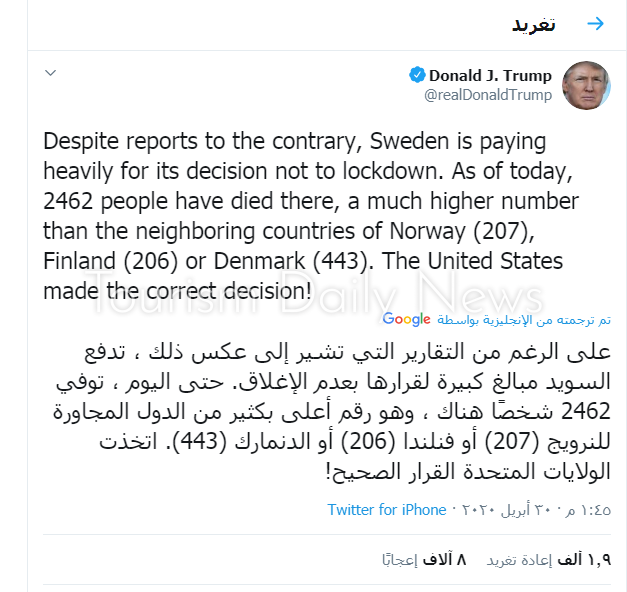 قال ترامب في التغريدة ( على الرغم من التقارير التي تشير إلى عكس ذلك ، تدفع السويد مبالغ كبيرة لقرارها بعدم الإغلاق. حتى اليوم ، توفي 2462 شخصًا هناك ، وهو رقم أعلى بكثير من الدول المجاورة للنرويج (207) أو فنلندا (206) أو الدنمارك (443). اتخذت الولايات المتحدة القرار الصحيح!).