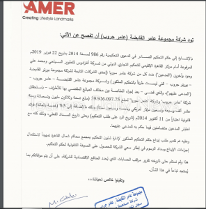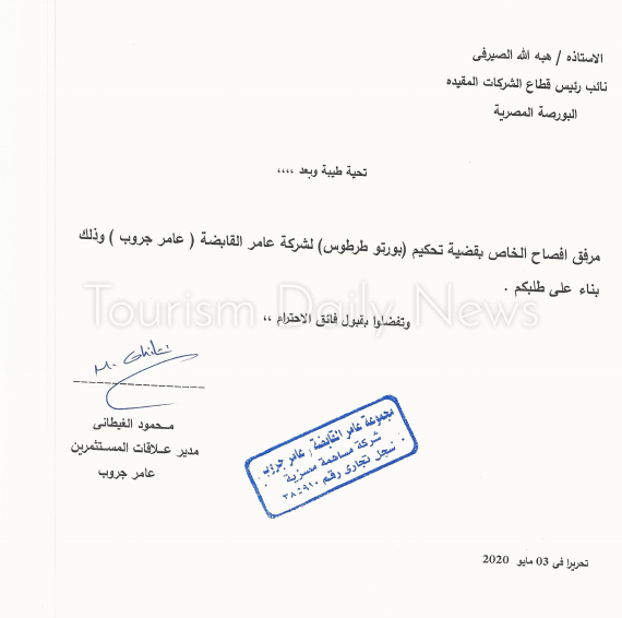 جاء ذلك في بيان من الشركة بخصوص الحقوق الاقتصادية لمجموعة عامر القابضة في الحكم الصادر في تحكيم مشروع بورتو طرطوس، مرسل للبورصة المصرية.