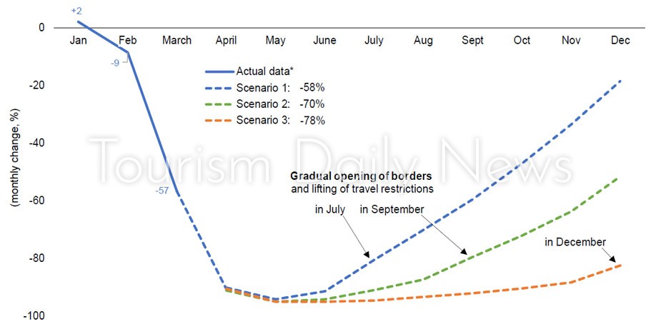 ووضعت المنظمة 3 سيناريوهات للسياحة الدولية لعام 2020 تعتمد إلى تواريخ ممكنة للانفتاح التدريجي للحدود الدولية ومن ثم بداية التعافي، وهي:
