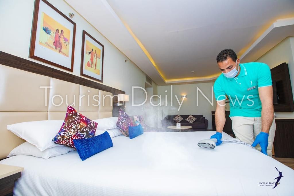 ووفقاً لمنشور للغرفة عممته على الفنادق، جاء البند الأول الإلتزام بعدم تسكين الغرفة الفندقية بعد مغادرة (النزيل/النزلاء) إلا بعد مرور 48 ساعة “على الأقل” يتم خلالها اتخاذ كافة إجراءات التعقيم والتطهير وفقاً للمعايير الصحية المعتمدة والواجب العمل بها فى هذا الشأن.