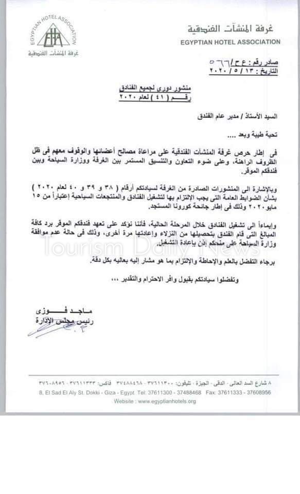 كتب – أحمد رزق : وزعت غرفة المنشآت الفندقية برئاسة ماجد فوزى منشوراً على أصحاب الفنادق تطالبهم بتعهدات برد كافة المبالغ التى قام الفندق بتحصيلها من النزلاء , وإعادتها مرة أخرى , وذلك فى حالة عدم موافقة وزارة السياحة على منح الفندق إذن بالتشغيل .
