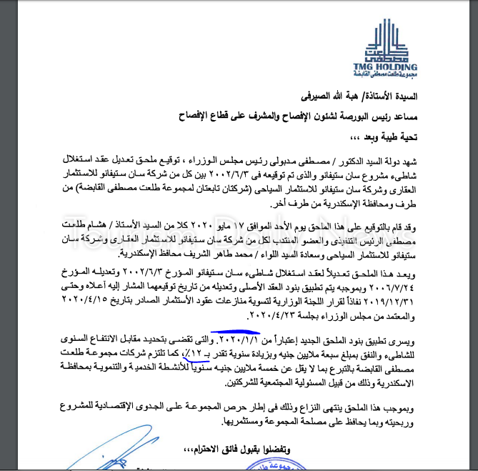 وأشارت الشركة إلى أن هذا الملحق يعد تعديل لعقد استغلال شاطئ سان ستيفانو المؤرخ 3 يونيو 2002 وتعديله المؤرخ 24 يوليو 2006، والذي بموجبه يتم تطبيق بنود العقد الاصلي وتعديل من تاريخ التوقيع وحتى 31 ديسمبر 2019، نفاذا لقرار اللجنة الوزارية لتسوية منازعات عقود الاستثمار.