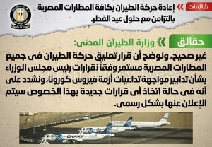 واكدت وزارة الطيران المدني، أنه لم يتم إصدار أية قرارات بشأن إعادة حركة الطيران بكافة المطارات المصرية بالتزامن مع حلول عيد الفطر.