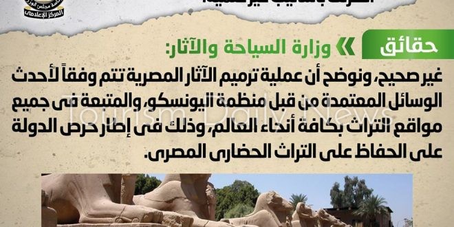 كتبت – سحر عبد الغني: قال المركز الاعلامي لمجلس الوزراء في التقرير الأسبوعي ” توضيح الحقائق”، انه تردد في بعض المواقع الإلكترونية وصفحات التواصل الاجتماعي صور تفيد بترميم تماثيل الكباش الموجودة في معابد الكرنك بأساليب غير علمية.