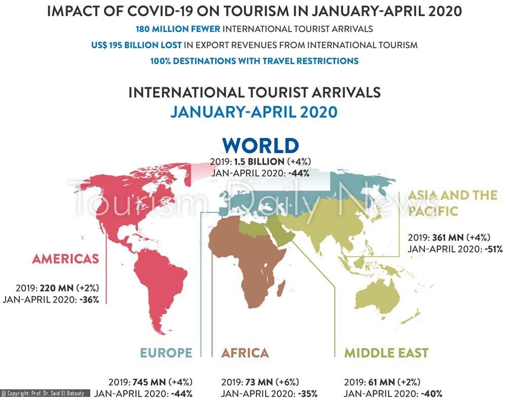 وأوضحت أن الفترة التراكمية من يناير حتى أبريل 2020 انخفض عدد السائحين الدوليين خلالها بنسبة -44% مما أدى إلى خسارة حوالي 195 مليار دولار أمريكي في عائدات السياحة الدولية.