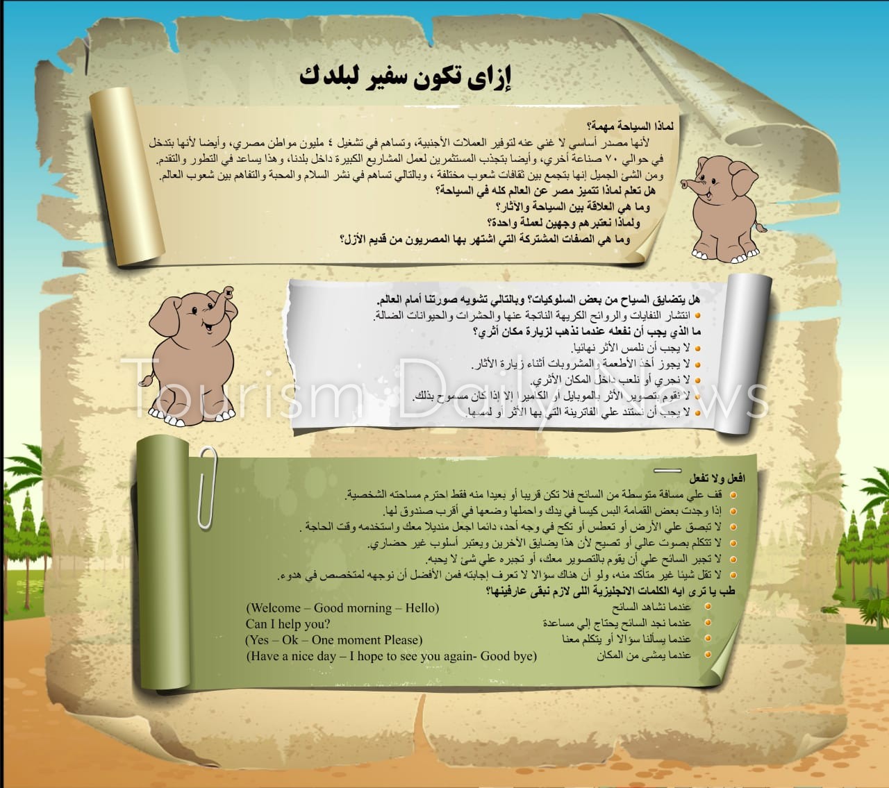 وأشارت د. كمال إلى أنه نظرا لسعي الوزارة لزيادة التوعية السياحية لدى الأطفال فقد تم تخصيص جزء من الكتاب بالإرشادات السياحية، بهدف تعليم الطفل أساسيات التعامل مع السائح وحثه على أن يكون سفيرا لبلده. كما تم وضع بالكتيب كود التفعيل لموقع الوزارة يستطيع الطفل من خلال الموبايل الدخول على الموقع ومتابعة البرامج والأنشطة المختلفة.