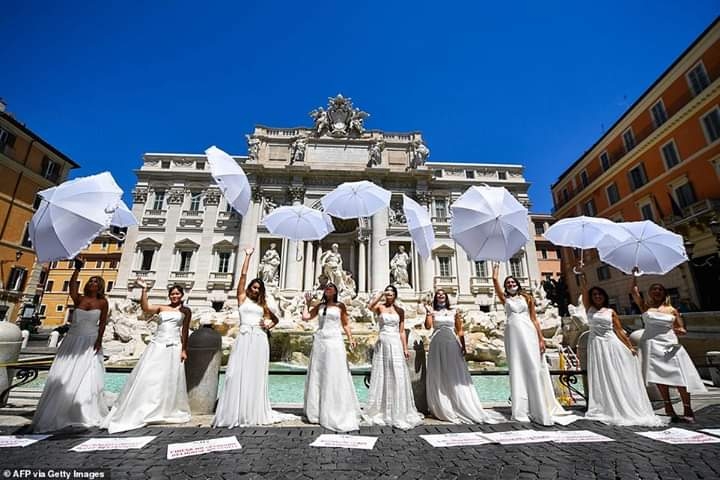 كتب – أحمد زكي : بالمظلات والفساتين البيضاء نظم مجموعة من الفتيات مظاهرة يحتججن أمام نافورة تريفي في العاصمة الإيطالية روما على تأجيل حفل زفافهن ضمن الإجراءات الاحترازية للوقاية من تفشي فيروس كورونا التى اتخذتها البلاد.