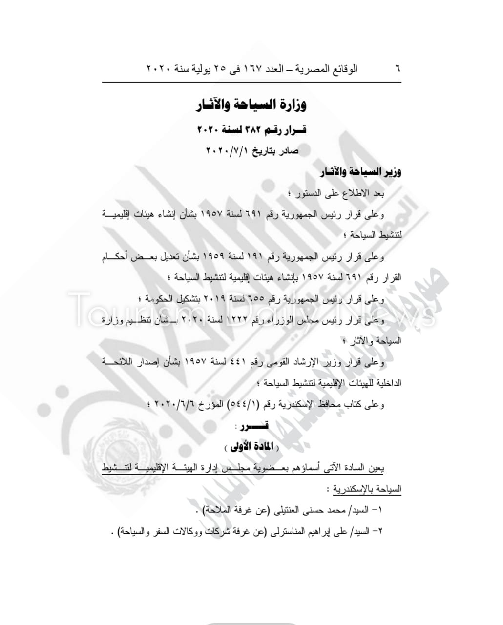 ونشرت الجريدة الرسمية، اليوم السبت، نص القرار الصادر بتاريخ 1 يوليو 2020، بعد الإطلاع على قرارات رئيس الجمهورية رقم 691 لعام 1957 بشأن هيئات إقليمية لتنشيط السياحة، وقرار 191 لسنة 1959، وعلى قرار رئيس الوزراء رقم 1222 لسنة 2020 بشأن تنظيم وزارة السياحة والآثار.