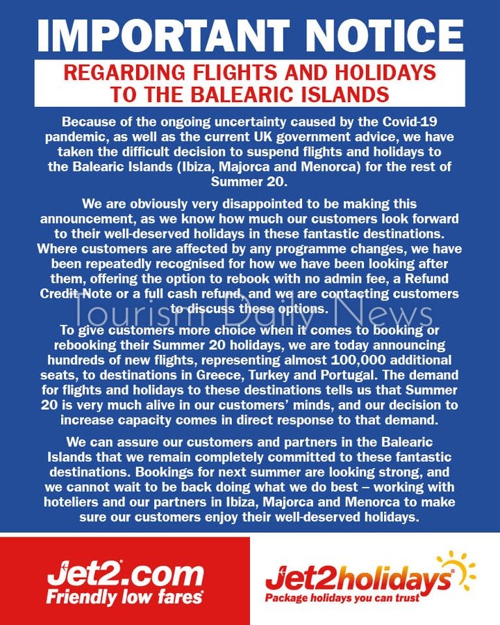 كتب- قاسم كمال: أعلنت شركة “جيت 2” البريطانية، إلغاء جميع رحلاتها الصيفية لعام 2020، إلى جزر البليار (إيبيزا ومايوركا ومينوركا)، بسبب عودة انتشار فيروس كورونا.