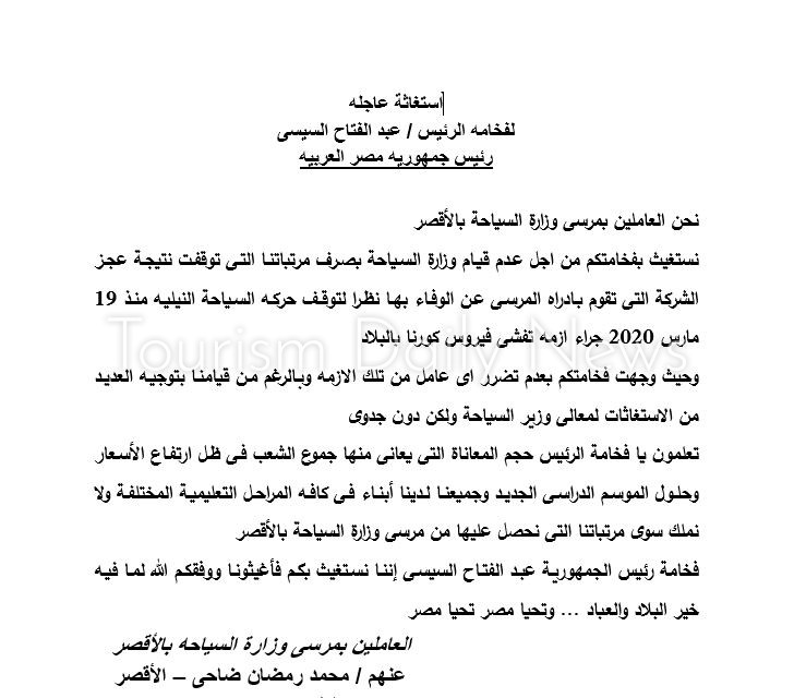 أرسل عمال مرسى وزارة السياحة بالأقصر استغاثة عاجلة للرئيس عبد الفتاح السيسى بسبب رفض الشركة التى تدير مرسى وزارة السياحة صرف مرتباتهم والتى توقفت نتيجة عجز الشركة عن الوفاء بها نظرا لتوقف حركة السياحة النيلية منذ 19 مارس 2020 جراء ازمة تفشى فيروس كورنا عالمياً وتوقف حركة السياحة بالبلاد .