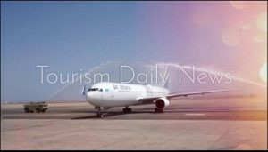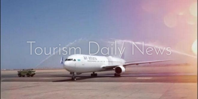 وقال بيان وزارة الطيران المدني صادر مساء اليوم الخميس، تم استقبال الطائرة بتقليد رش المياه وإستقبال الركاب بالورود وكان في إستقبالهم الطيار حسين السعيد نائب مدير مطار شرم الشيخ الدولي .