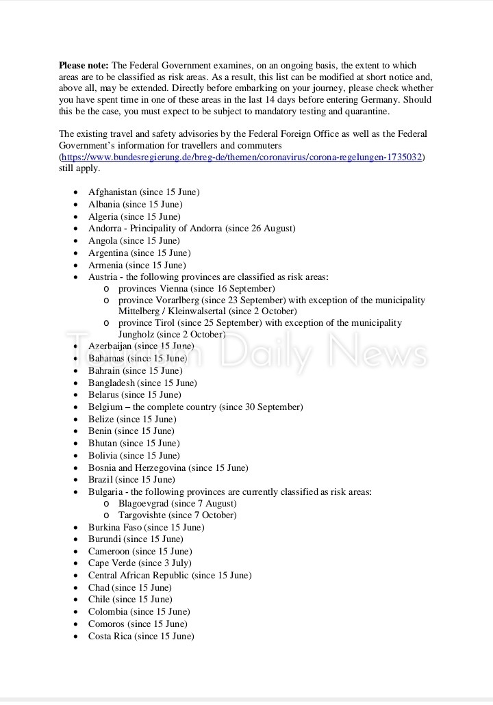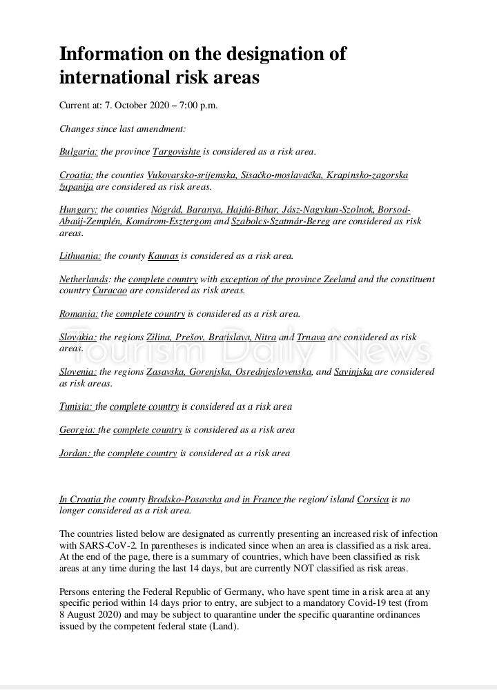 توريزم ديلى نيوز ووكالات: أعلنت الحكومة الألمانية إدراج تونس والأردن وجورجيا ورومانيا ضمن البؤر الخطيرة لوباء كورونا، مما يلزم العائدين من هذه البلدان بدخول الحجر الصحي حتى تثبت الفحوص خلوهم من الفيروس.