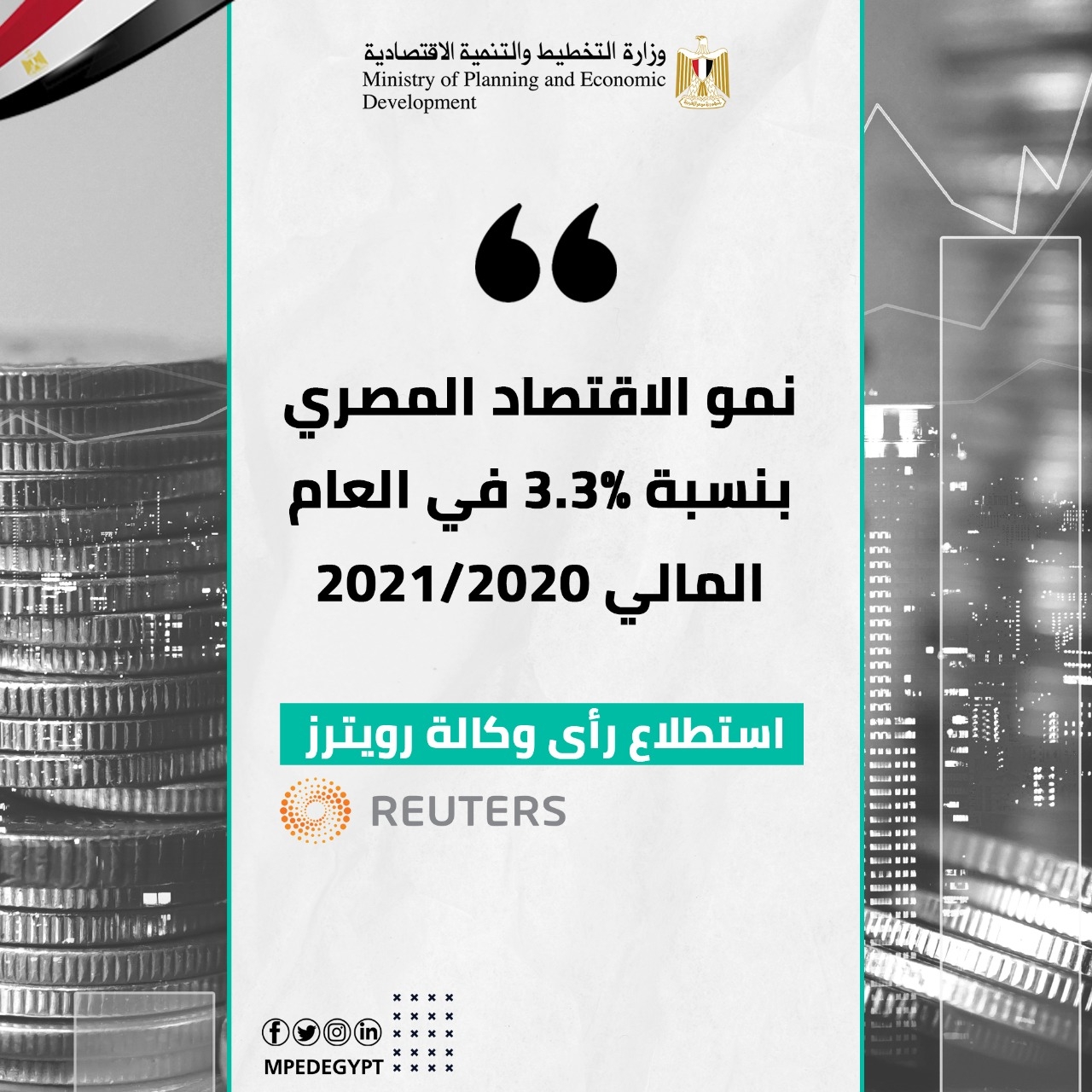 كما أشار تقرير وزارة التخطيط والتنمية الاقتصادية إلى استطلاع رأى وكالة رويترز الذي توقع نمو الاقتصاد المصري بنسبة 3.3% في العام المالي الجاري 2021/2020، وهو استطلاع رأي بين عدد من الاقتصاديين عن الاقتصاد المصري.