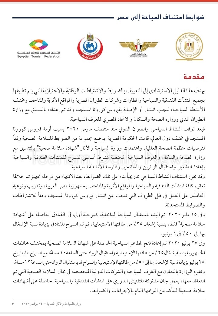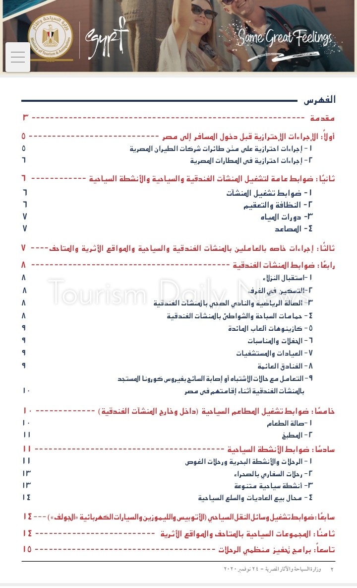 كتب- قاسم كمال: أعادت وزارة السياحة والآثار، تحديث الدليل الاسترشادي المتعلق بعودة النشاط السياحي المقاصد السياحية المختلفة، وفقا للضوابط والاشتراطات الوقائية والاحترازية التي يتم تطبيقها بجميع المنشآت الفندقية والسياحية والمطارات وشرطات الطيران المصرية والمواقع الأثرية والمتاحف ومختلف الأنشطة السياحية، لتجنب انتشار أو الإصابة بفيروس كورونا المستجد، وقد تم إعداده بالتنسيق مع وزارة الطيران ووزارة الصحة والسكان والاتحاد المصري للغرف السياحية.