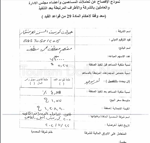 جولدن كوست للاستثمار السياحي تكشف عن تقليص مستثمر لأسهمه فى الشركة لـ 7.4%