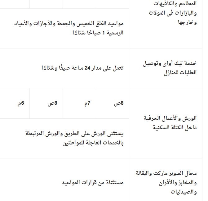 جدول مواعيد غلق المحلات التجارية والمولات والمطاعم والكافيهات والورش صيفًا وشتاءً: