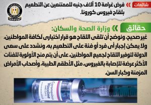 كتبت – سحر عبد الغني : أعلنت وزارة الصحة والسكان، حقيقة فرض أي غرامات مالية على الممتنعين عن التطعيم بلقاح فيروس كورونا وأكدت أنه لا صحة لفرض أي غرامات مالية على الممتنعين عن التطعيم .