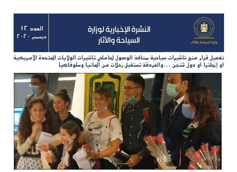 وأصدرت وزارة السياحة العدد 12 من نشرتها السياحية وتناولت عدة موضوعات بينها تفعيل قرار منح تأشيرات سياحية مبنافذ الوصول حلاملي تأشيرات الولايات المتحدة الأمريكية أو إنجلترا أو دول شنجن .. والغردقة تستقبل رحالات من ألمانيا وسلوفاكيا , وأول وفد إسباني يزور مصر منذ أزمة “كورونا” في منطقة الأهرامات .. وسائحة أوكرانية تدعو العالم لزيارة شرم الشيخ , كما تناولت النشرة تفاصيل زيارة وفد إعلامي صربي إلى مصر .