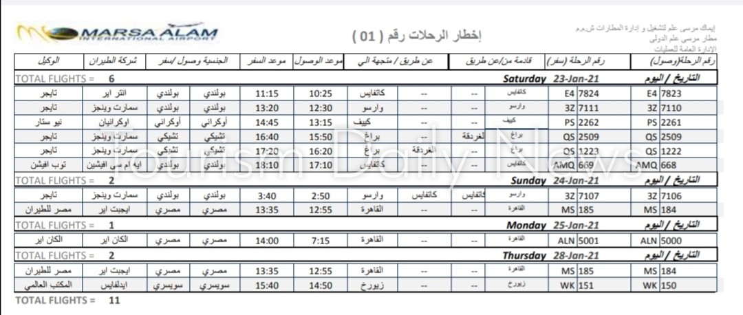 كتب :كمال المصري: يستقبل مطار مرسي علم الدولي، 8 رحلات طيران من 4 دول أوروبية، على متنها عدد من السائحين الأجانب من عدة دول، بداية من غداً السبت، بينها 4 رحلات من بولندا ورحلتين من التشيك ورحلة من أوكرانيا وأخري من سويسرا.