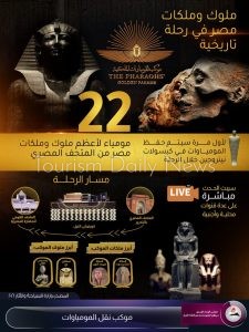 واشار في إنفوجراف، انه وسط موكب مهيب يبدأ من ميدان التحرير على متن عربات على الطراز الفرعوني مرورًا بضفاف النيل حتى متحف الحضارة.