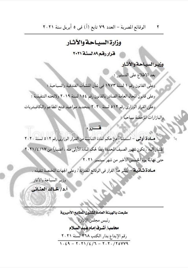 كتبت- مروة السيد : نشرت الجريدة الرسمية، قرار الدكتور خالد العناني وزارة السياحة والآثار، رقم 89 لسنة 2021 الخاص بتحديد مواعيد فتح المطاعم والكافتيريات والبازارات المرخصة سياحيا.