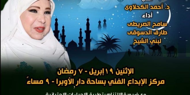 كتب – أحمدزكي : تقيم الفنانة القديرة مديحة حمدي صالونها الثقافي بعنوان “ليلة في حب رسول الله” ألحان: د. أحمدالكحلاوي، أشعار: سراج الدين عبد القادر، أداء: سامح الصريطي وطارق دسوقي ولبنى الشيخ، مع كلمات للفنان القدير ياسر صادق والدكتور هاني كمال .