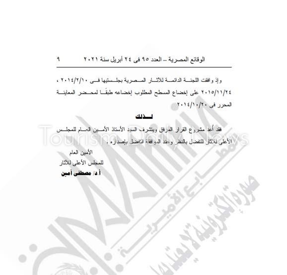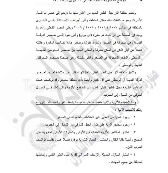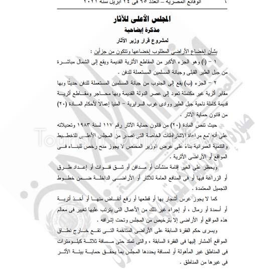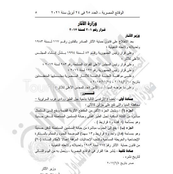 كتبت – دعاء سمير : أصدر الدكتور خالد العناني ، وزير السياحة والآثار، قرارا وزاريا برقم 201 لسنة 2017 بشأن إخضاع عدد من الأراضي بناحية جبل الطير ووادي غرب السرايربة بمحافظة المنيا.