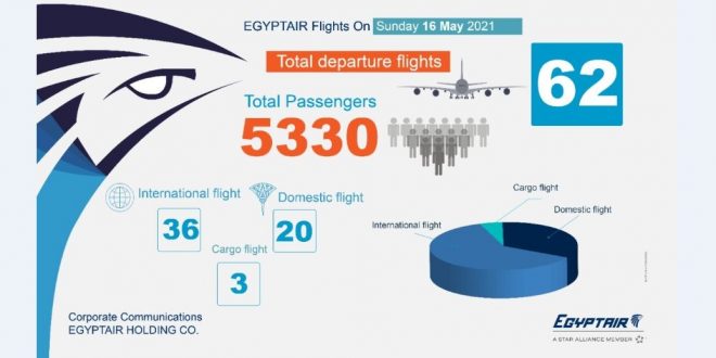 تسير مصر للطيران اليوم الأحد 16 مايو 62 رحلة جوية بمعدل 36 رحلة دولية و20 رحلة داخلية و3 رحلات شحن جوي وذلك لنقل 5320 راكبا وسط إلتزام تام بإتباع كافة الإجراءات الاحترازية للحد من انتشار فيروس كورونا في جميع مراحل السفر. إقرأ أيضاً : مستشفي مصر للطيران تحصل علي تسجيل الاعتماد والرقابة الصحية