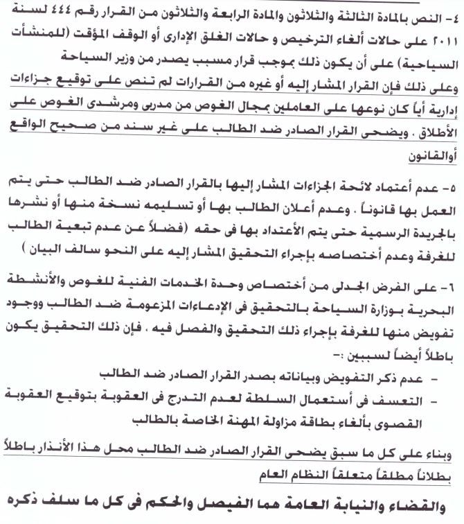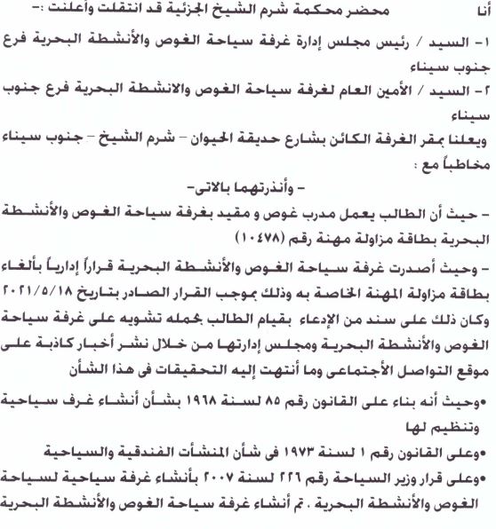 كتبت – مروة السيد : لجأ الغواصون المتضررون من قرار غرفة سياحة الغوص والأنشطة البحرية بوقف مزاولتهم للمهنة للقضاء بعد أن سدت في وجوههم كل الطرق واتهموا ادارة الغرفة بالتدخل في أمور ليست من اختصاصها والتعنت ضدهم في حين لم تلتفت إلى عملها الأساسي .