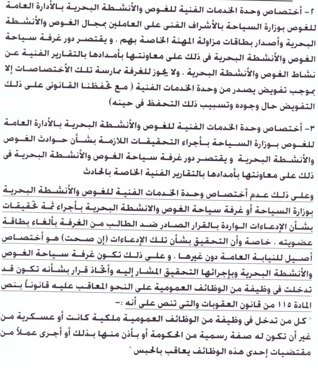 1- مخالفة المعايير الدولية لنشاط الغوص بعدم وجود اوكسجين طوارئئ وحقيبة إسعافات آولية أثناء تنفيذ النشاط.