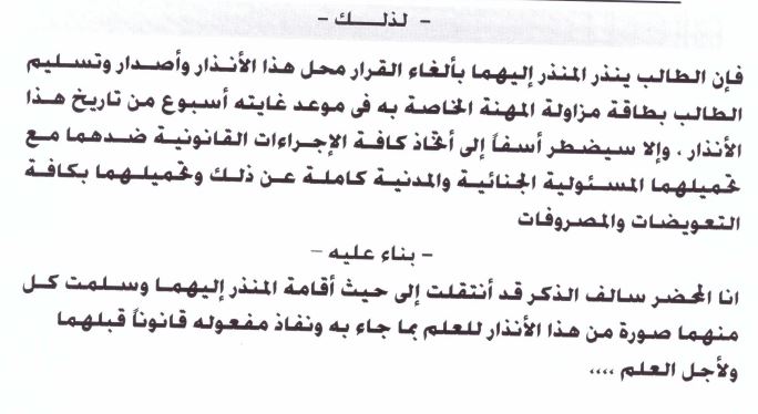 العقوبة: إلغاء بطاقة مزاولة المهنة الخاصة بكم، وذلك لمُخالفة الاتي: