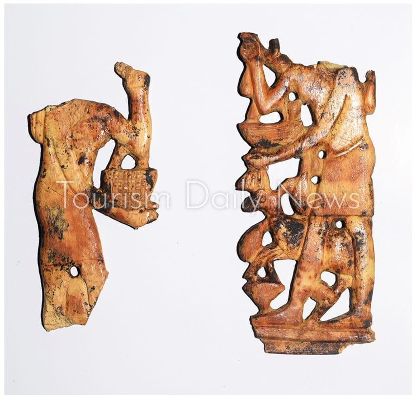 وأشار إلى أن البعثة قد اكتشفت مجموعة رائعة من المناظر المصورة على العاج لسيدات تحملن القرابين، ومناظر الحياة اليومية لأفراس الدلتا بما فيها من نباتات وطيور وحيوانات، وعتب كبير من الحجر الجيري عليه نصوص هيروغليفية بالنقش الغائر، وجزء من لوحة ملكية لملك يؤدي طقوس دينية بمعبد بوتو، وبعض القطع مسجل عليها نصوص وأسطر هيروغليفية، والألقاب الخمسة للملك بسماتيك الأول، واسم الملكين “واح ايب رع” و ” أحمس الثاني” من ملوك الأسرة 36 .